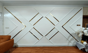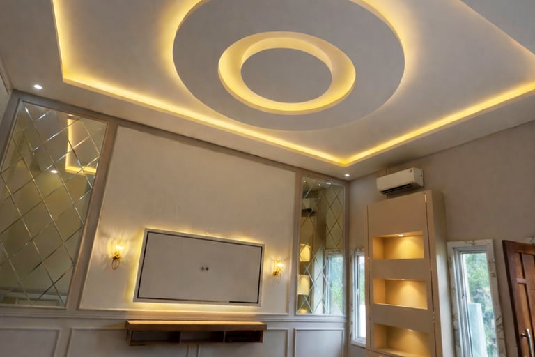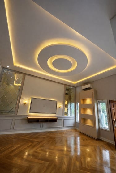 Perpaduan desain plafon geometris dan elemen lighting dekoratif yang menciptakan suasana hangat, modern, dan berkarakter. - Lokasi: Private Residence, Jl. Dr. Wahidin, Pontianak, KalBar -